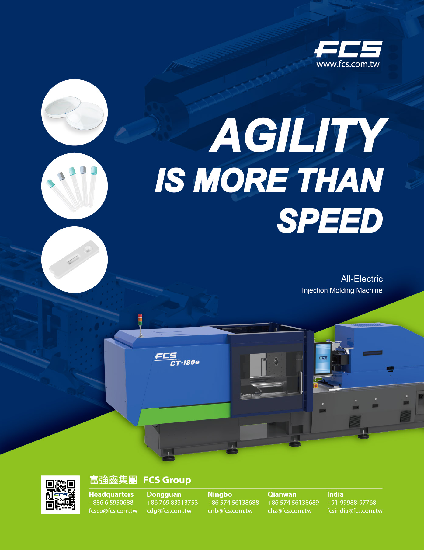 FCS에서 새롭게 출시한 CT-e 시리즈 전자동 사출 성형기는 포장, 광학 부품, 의료, 노트북이나 복합기 부품과 같은 3C 가전 제품 등 다양한 산업 분야에 적용 가능합니다. 클램핑력은 50톤에서 1,100톤까지 다양합니다.