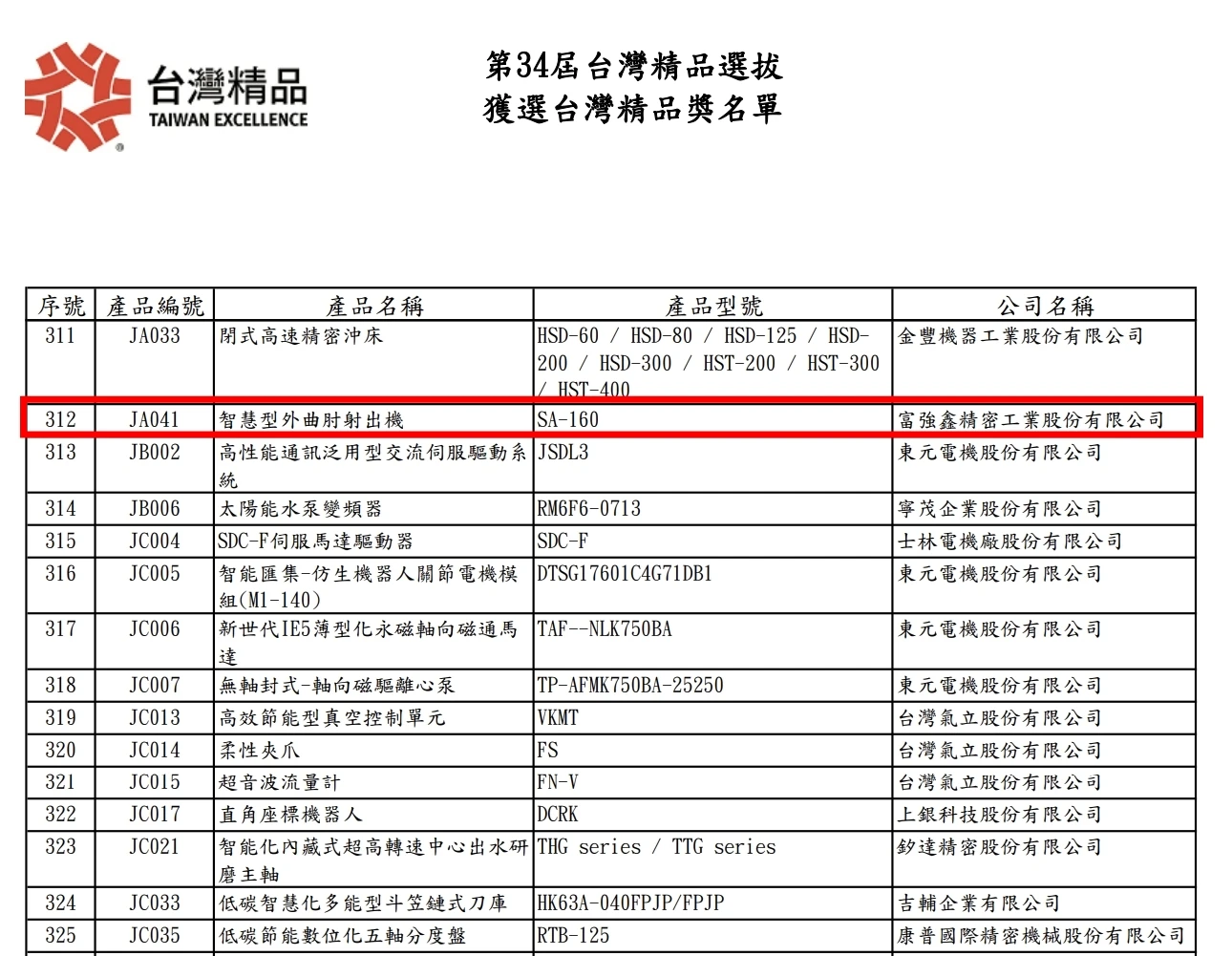 FCS 그룹은 자사의 SA-160 지능형 아웃워드 토글 사출 성형기가 제34회 "대만 우수상"을 수상했다고 발표했습니다. 경제부가 주관하고 TAITRA가 주관하는 이 상은 혁신적인 디자인, 성능, 품질, 그리고 시장 경쟁력을 갖춘 제품을 선정하는 상이며, 대만산(MIT) 제품의 우수성을 상징하는 최고의 영예로 여겨집니다.