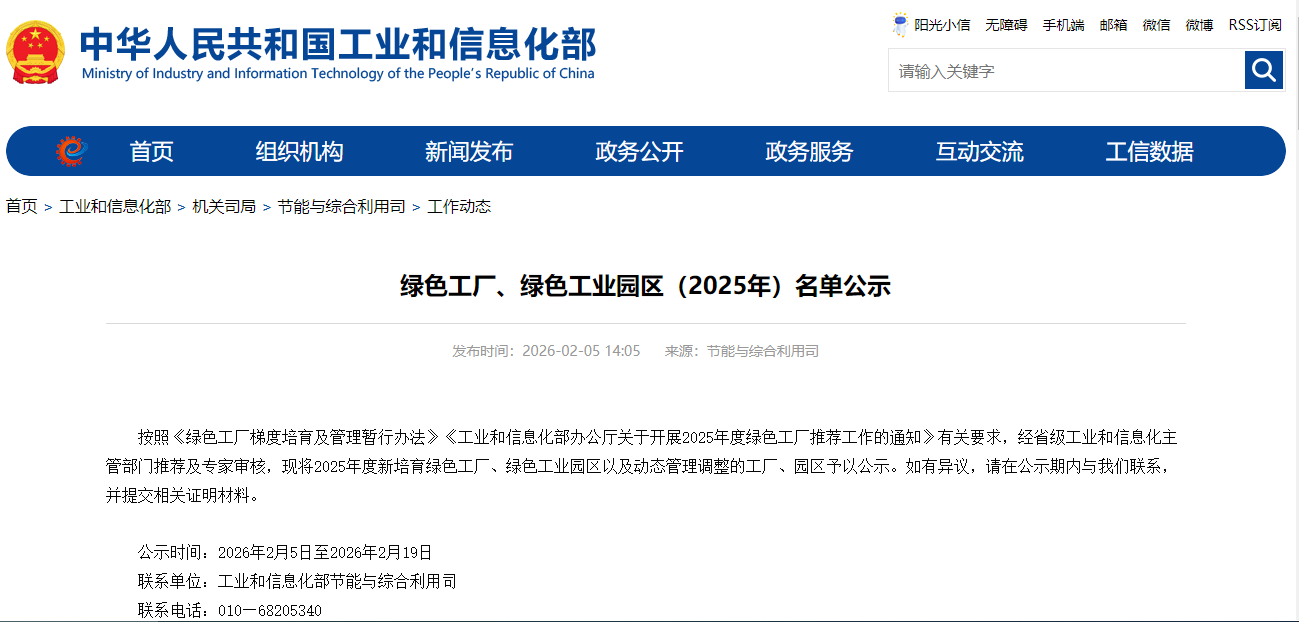2026년 2월 5일, 2025년 녹색 제조 시스템 공개 목록이 공식적으로 발표되었습니다.