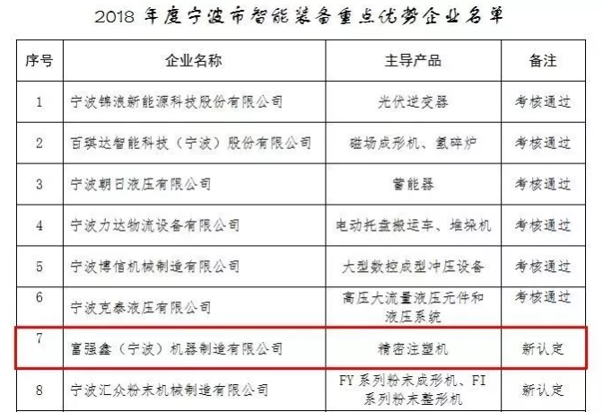 푸창신은 2018년 닝보 스마트 장비 산업 핵심 우수 기업으로 선정되었습니다.